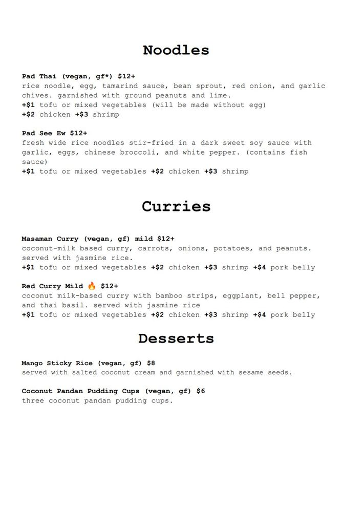 Vegan, gluten-free. Coconut milk-based curry with peas, zucchini, bell pepper, and thai basil. Served with jasmine rice.