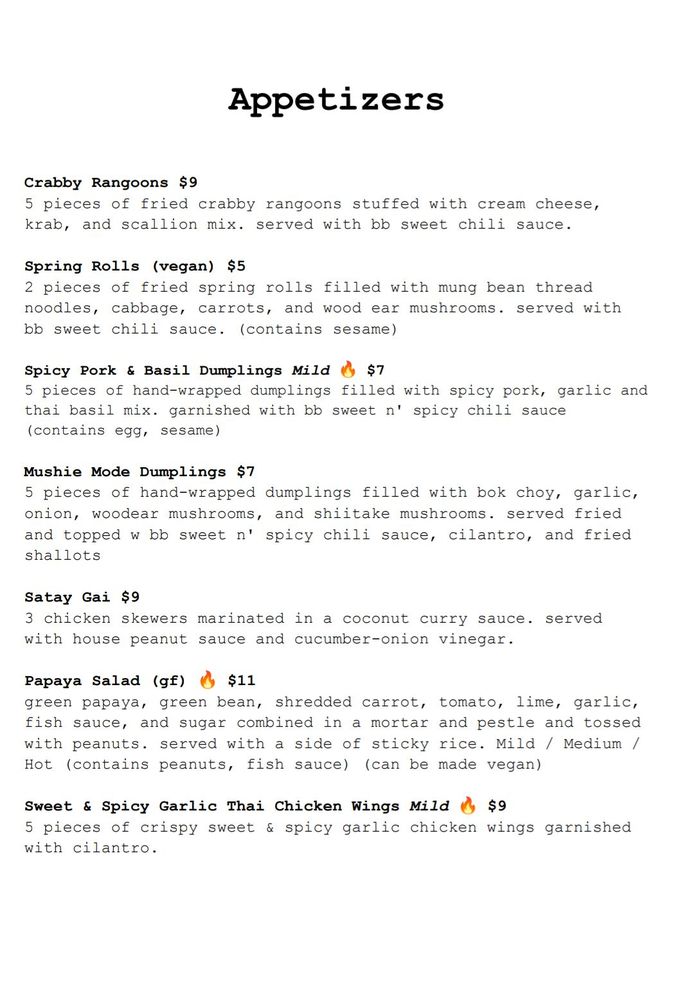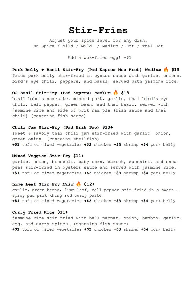Basil Babe’s namesake. Minced pork, garlic, thai bird's eye chili, bell pepper, green bean, and thai basil. Served with jasmine rice and side of nam pla pik (chili and fish sauce)